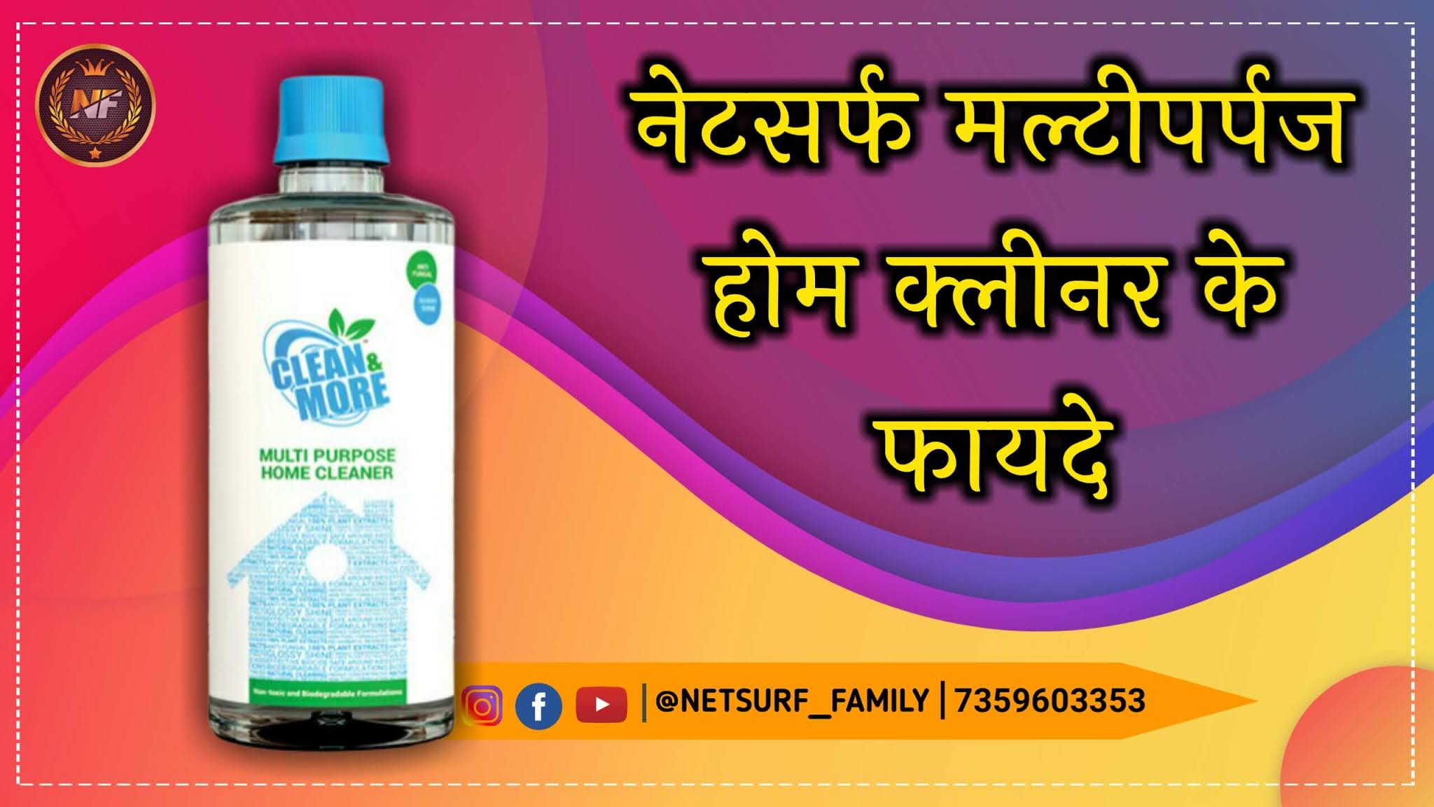 नेटसर्फ़ क्लीन एंड मोर मल्टीपर्पज होम क्लीनर नेटसर्फ़ कम्यूनिकेशन प्राइवेट लिमिटेड कंपनी बनाती है ये कंपनी डाइरेक्ट सेलिंग कंपनी है। मतलब की इसके प्रॉडक्ट्स मार्केटमे आपको नहीं मिलेंगे इसके प्रोडक्ट लेने केलिए आपको उनके डाइरेक्ट सेलर के पास जाना पड़ता है। अगर आप नेटसर्फ़ के डिस्ट्रीब्यूटरसे लेते हो तो आपको 15% से लेकर 30% तक छूट भी मिलती है हम भी नेटसर्फ़ के डाइरेक्ट सेलर है अगर आप हमसे खरीदना चाहते है तो नीचे दिए गए बाय नाऊ के बटन पर क्लिक करे।